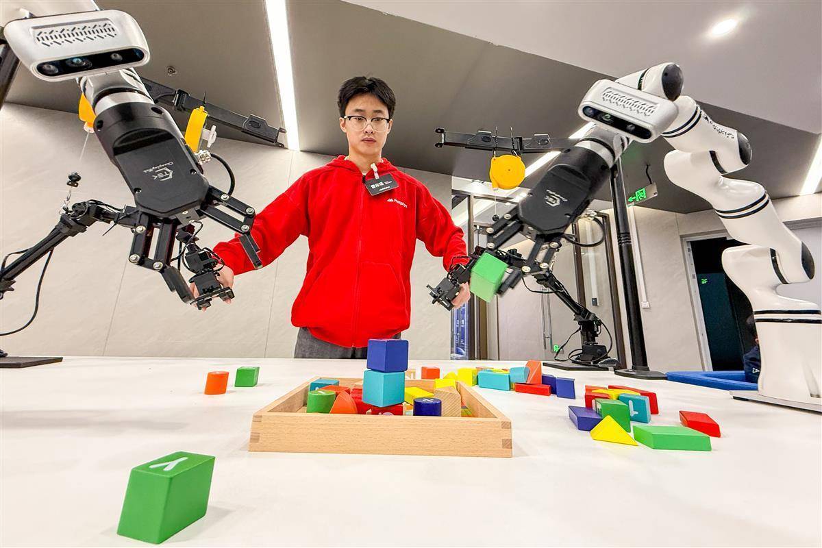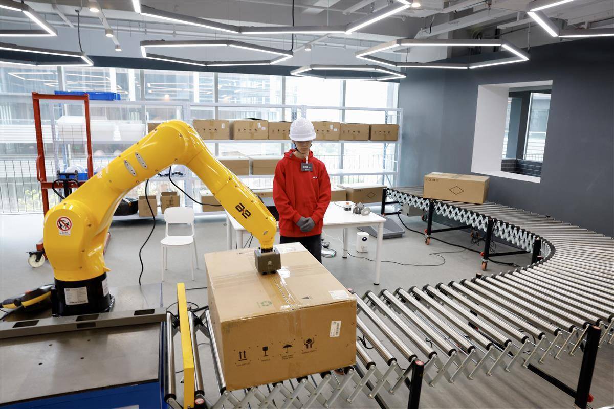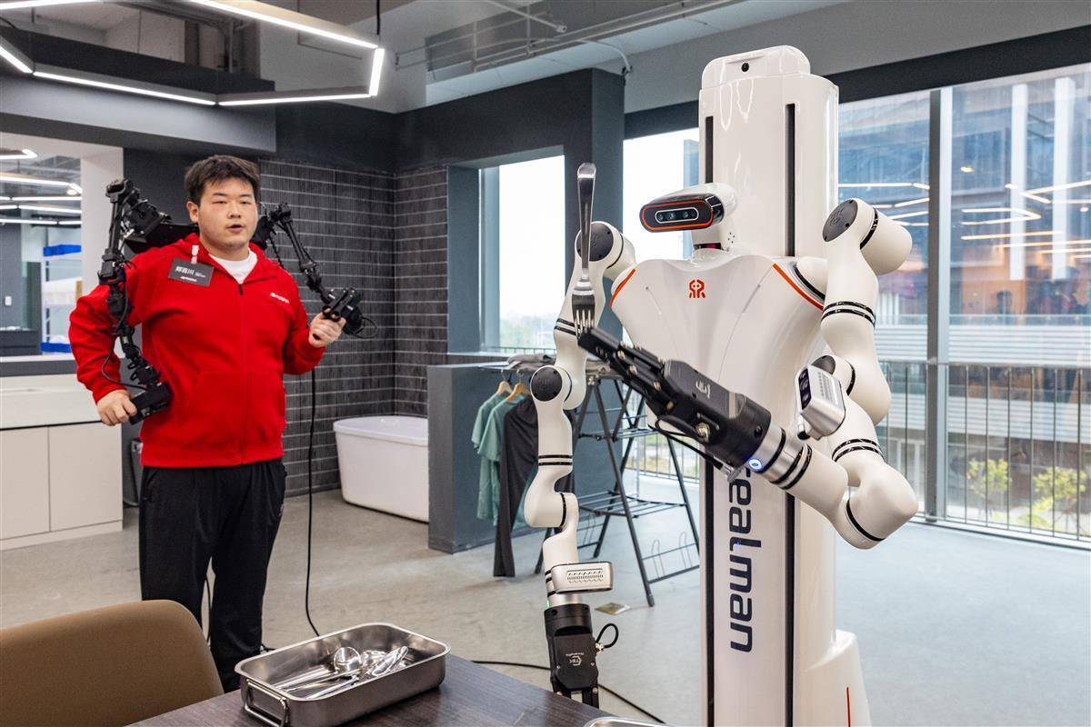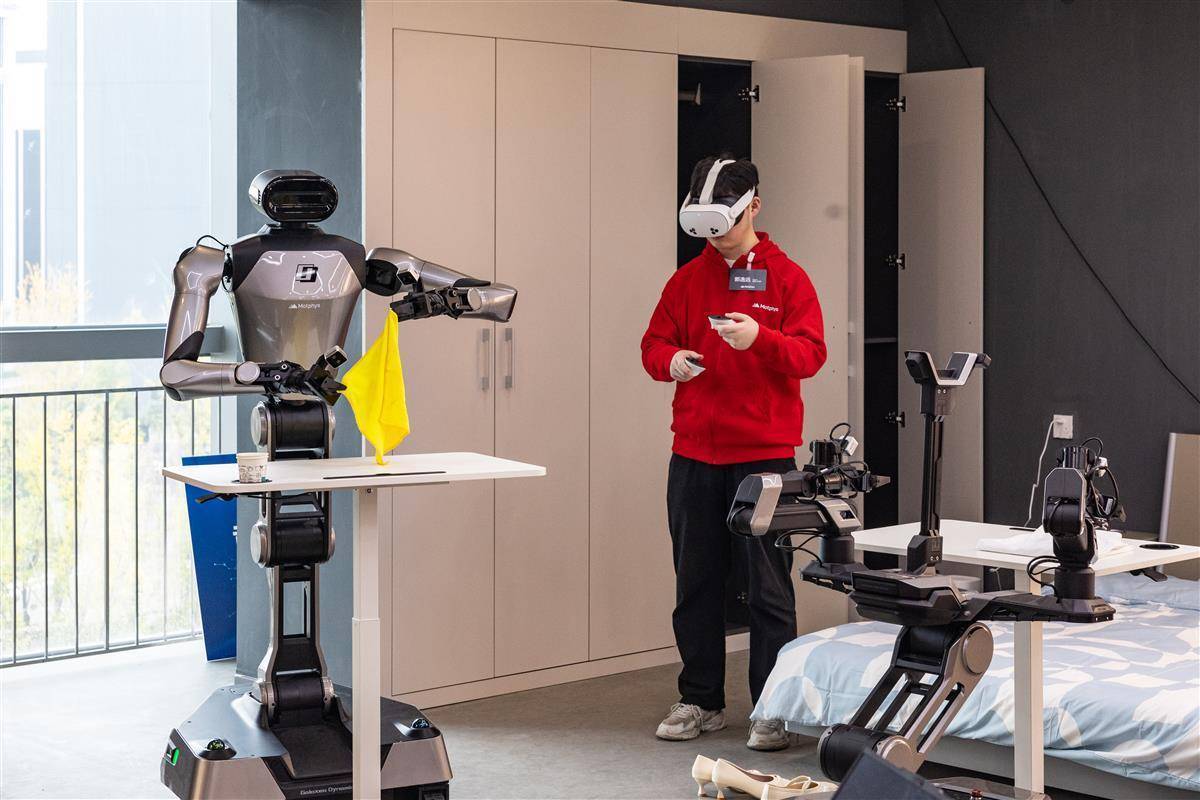 图为在机器东谈主仿信得过磨练场产品区场景中,责任主谈主员操作机器东谈主完成指定任务,并对经过中的数据进行网罗。