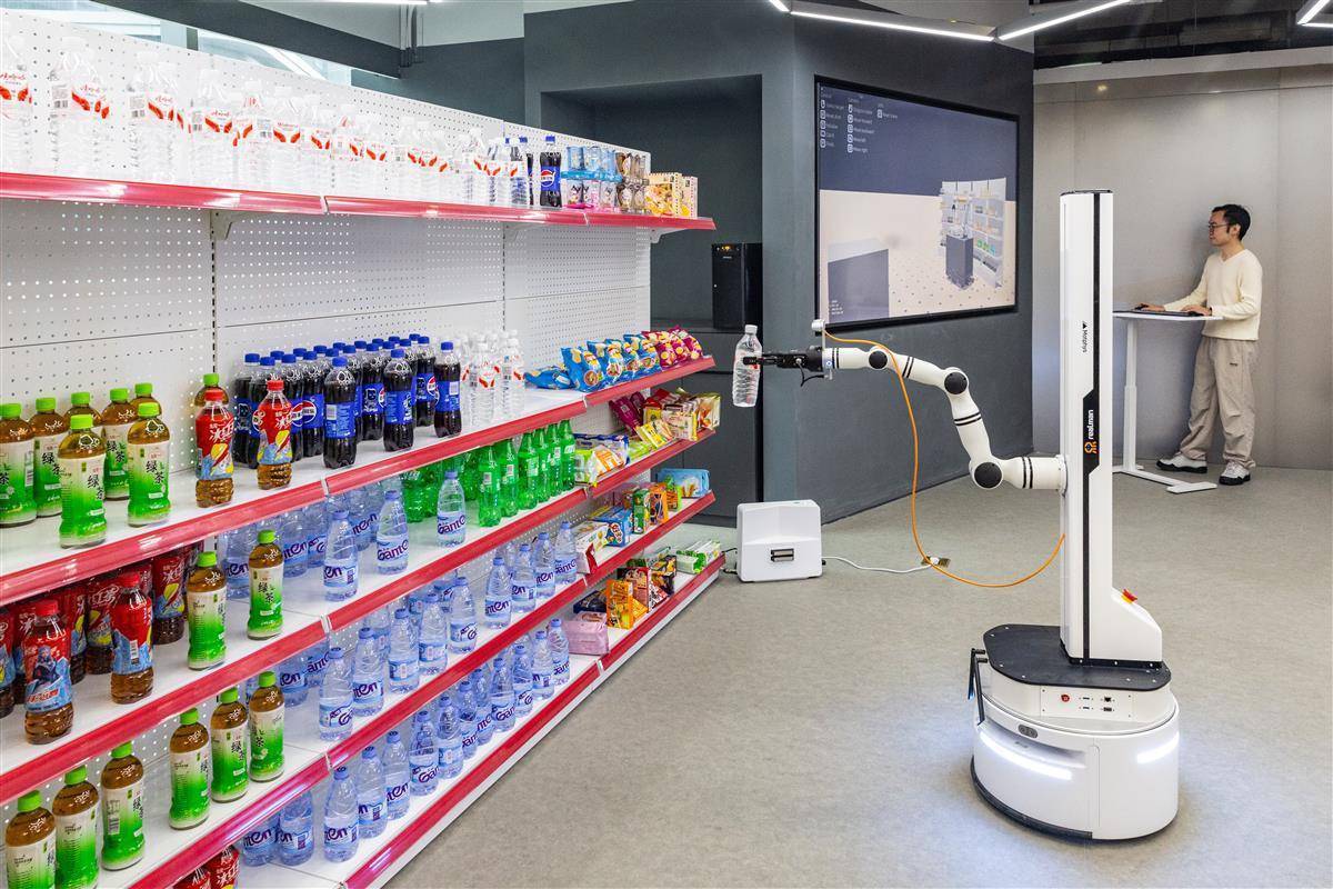 图为在机器东谈主仿信得过磨练场内,责任主谈主员在对商超区场景的机器东谈主进行数据网罗。