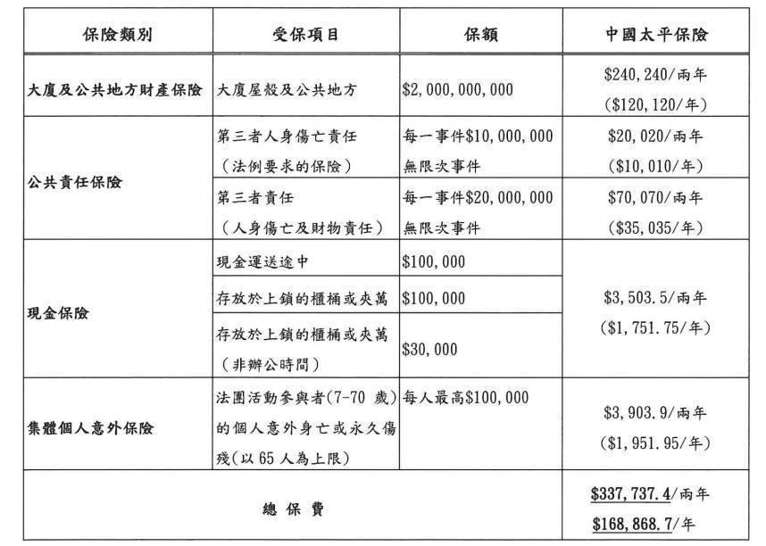 值得寄望的是,尽管“大维修”工程决然启动,但仅有的报价方太平香港,依旧给出了与之前调换价钱的报价;此外,另一份公开文献还袒露,太平香港同期承保了宏业建筑工程有限公司的职守险,理赔金额最高可达3.66亿港元;以及每次事故最高可达2亿港元的雇员补偿保障,保单有用期为2024年7月至2027年7月。