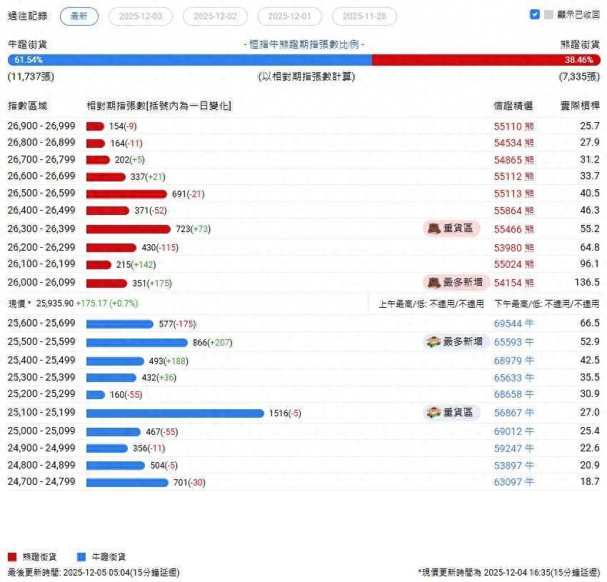 智通财经APP获悉,扫尾12月5日,恒指最新的牛熊街货比例为62:38。