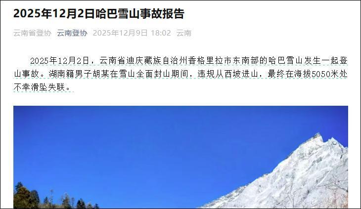 云南登山协会发布事故敷陈称,2025年12月2日,云南省迪庆藏族自治州香格里拉市东南部的哈巴雪山发生一齐登山事故。湖南籍须眉胡某在雪山全面封山技能,违纪从西坡进山,最终在海拔5050米处苦难滑坠失联。